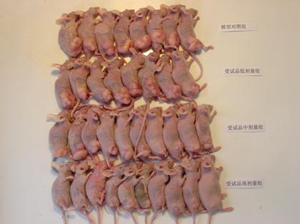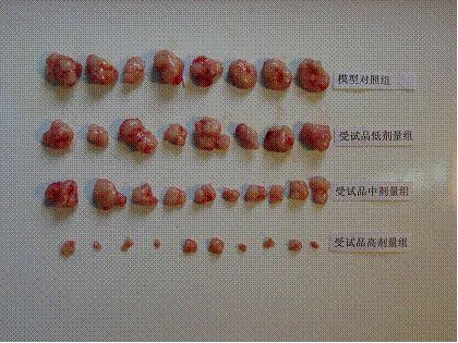 模型对照组为空白对照组,受试品组为乐复能治疗组。图中可见,经过30天的乐复能治疗,无论是高剂量组还是低剂量组,裸鼠体内的肿瘤均小于对照组,高剂量组抑瘤效果尤为明显。由此可见,乐复能对接种到裸鼠体内的前列腺癌细胞株(PC-3)有强烈的抑制作用。