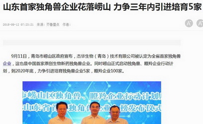 青报网:全省首家独角兽企业杰华生物“花落”崂山